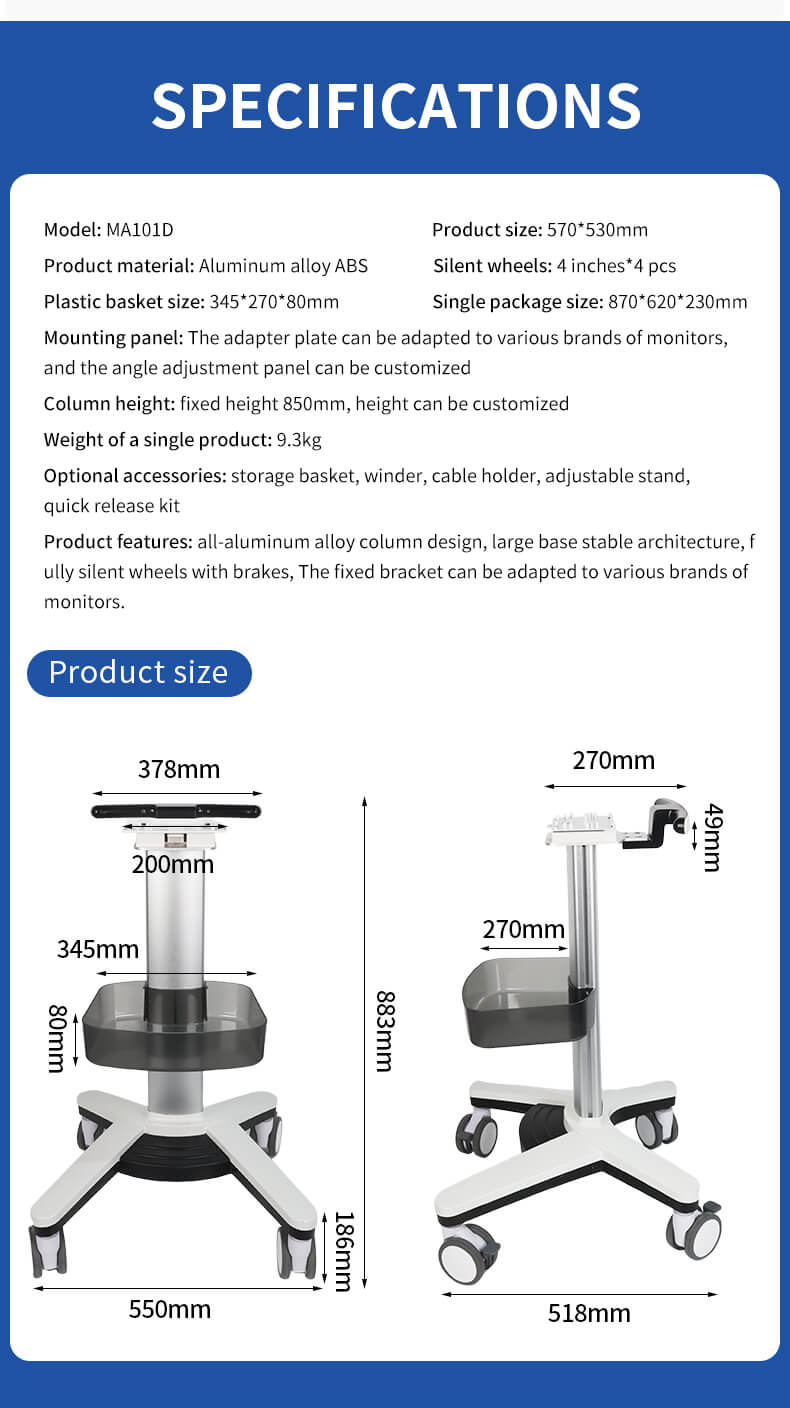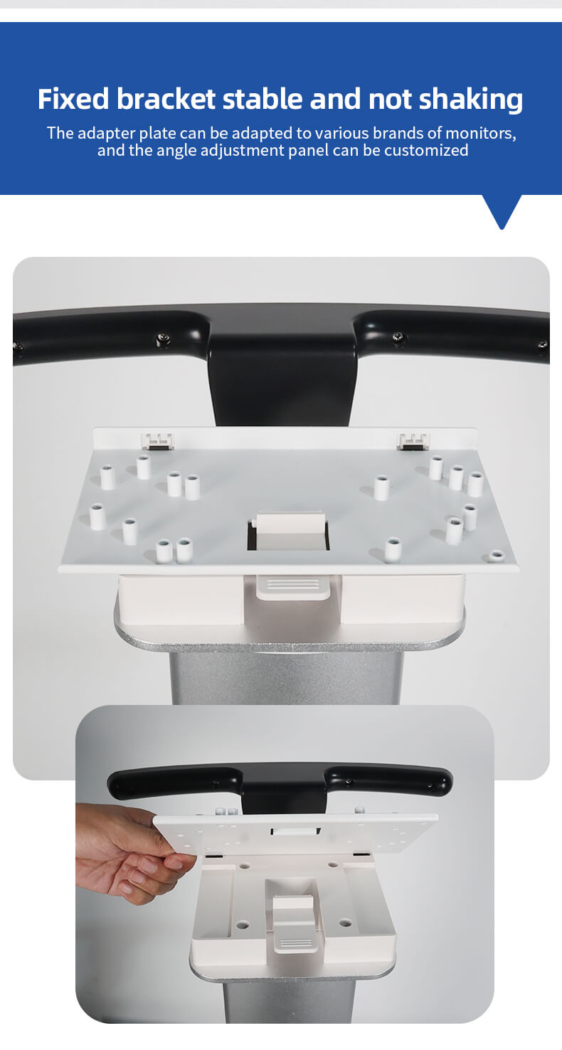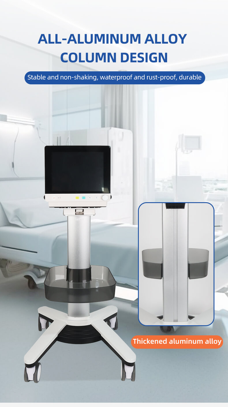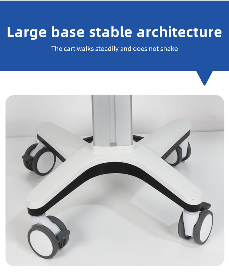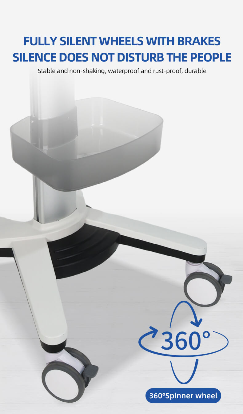 All aluminum alloy column design, large base stable structure, fully silent tire brake, fixed bracket adjustable forward and backward tilt 0-25 degrees.