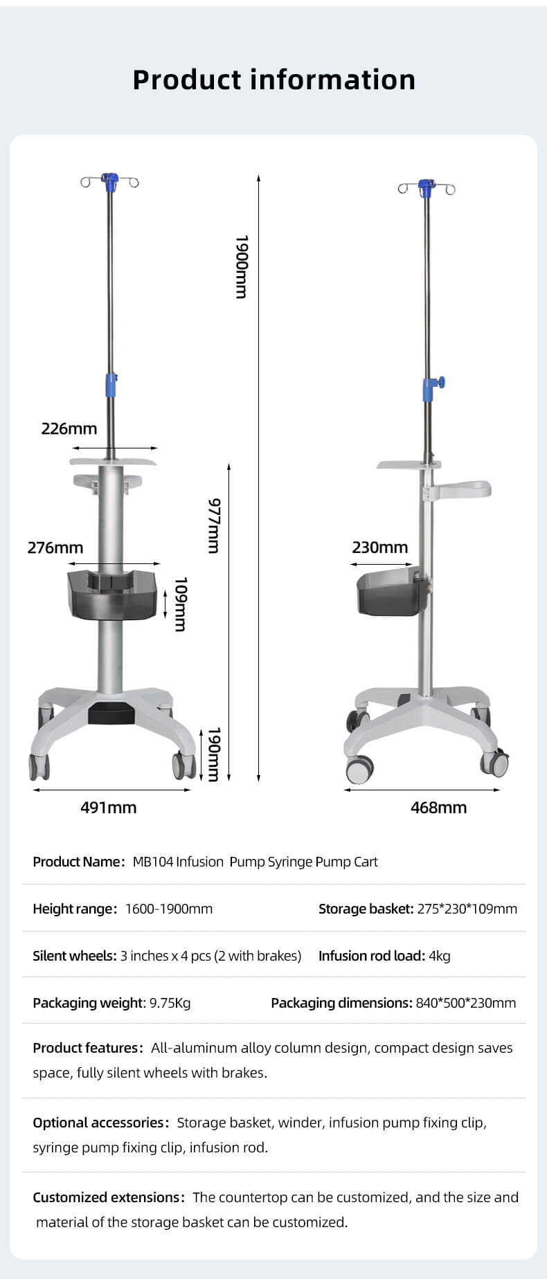 Weight bearing capacity of infusion rod: 4kg