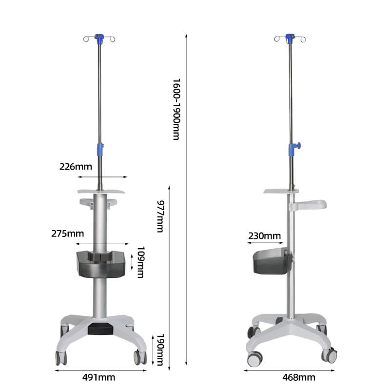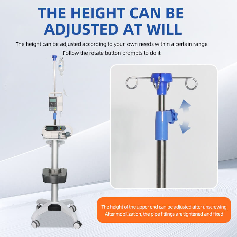 The height is adjustable within the range of 1600–1900 mm, and can be easily adapted to the height and operational preferences of different healthcare professionals through a simple knob mechanism. The trolley comes standard with a metal multi-hook infusion pole, capable of supporting 1 syringe pump + 1 infusion pump simultaneously to meet basic synchronous infusion needs.