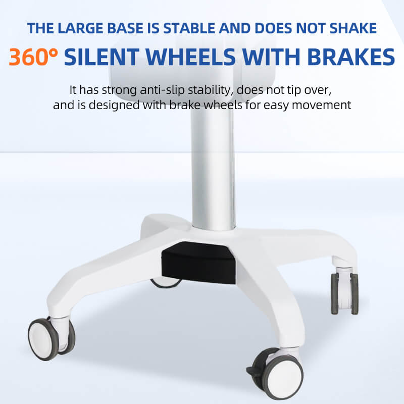 The trolley features a large base design that ensures stability both during movement and when stationary. It is equipped with four 3-inch fully silent swivel casters, two of which have brakes, allowing 360° smooth maneuverability and secure parking. The trolley moves quietly and easily, making it suitable for environments with limited space such as consultation rooms, community clinics, and home care settings.