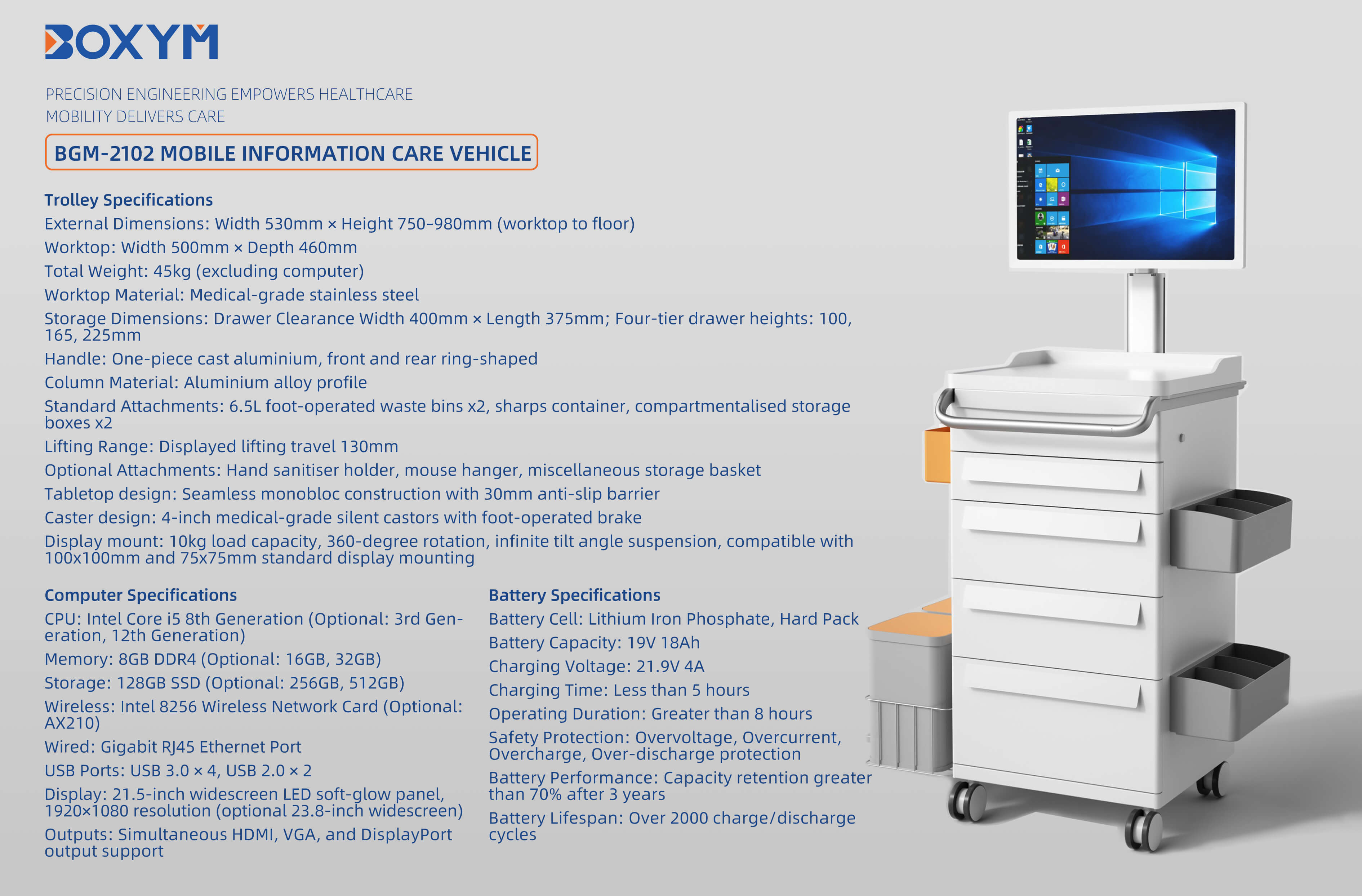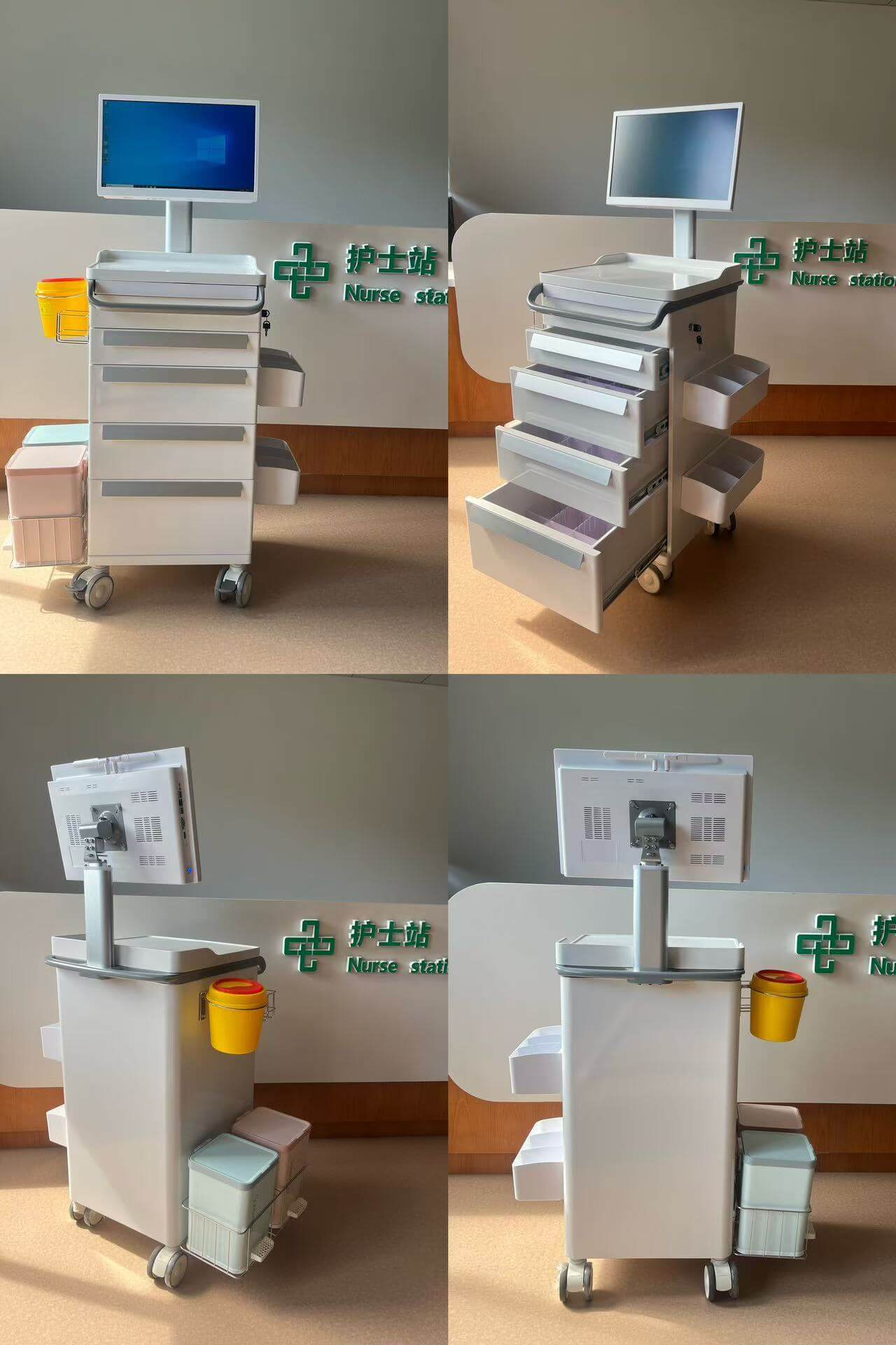 Standard Attachments: 6.5L foot-operated waste bins x2, sharps container, compartmentalised storage boxes x2